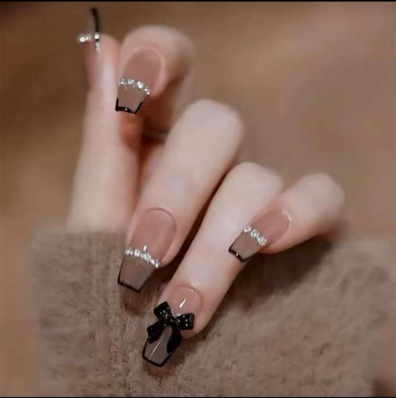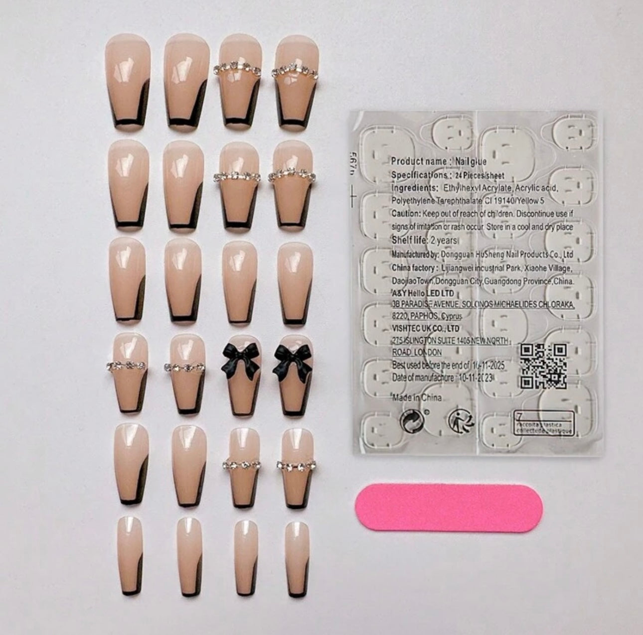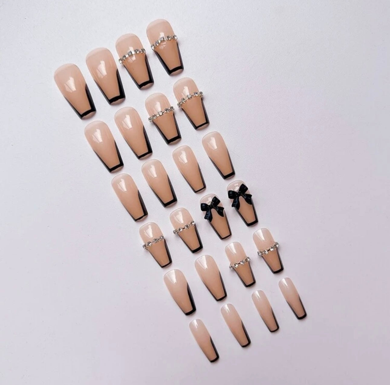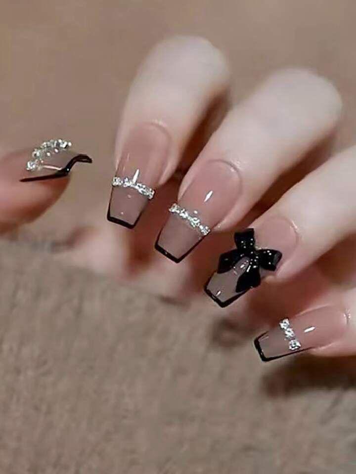 Long T-shaped Black French 3D Bow Press on Nails