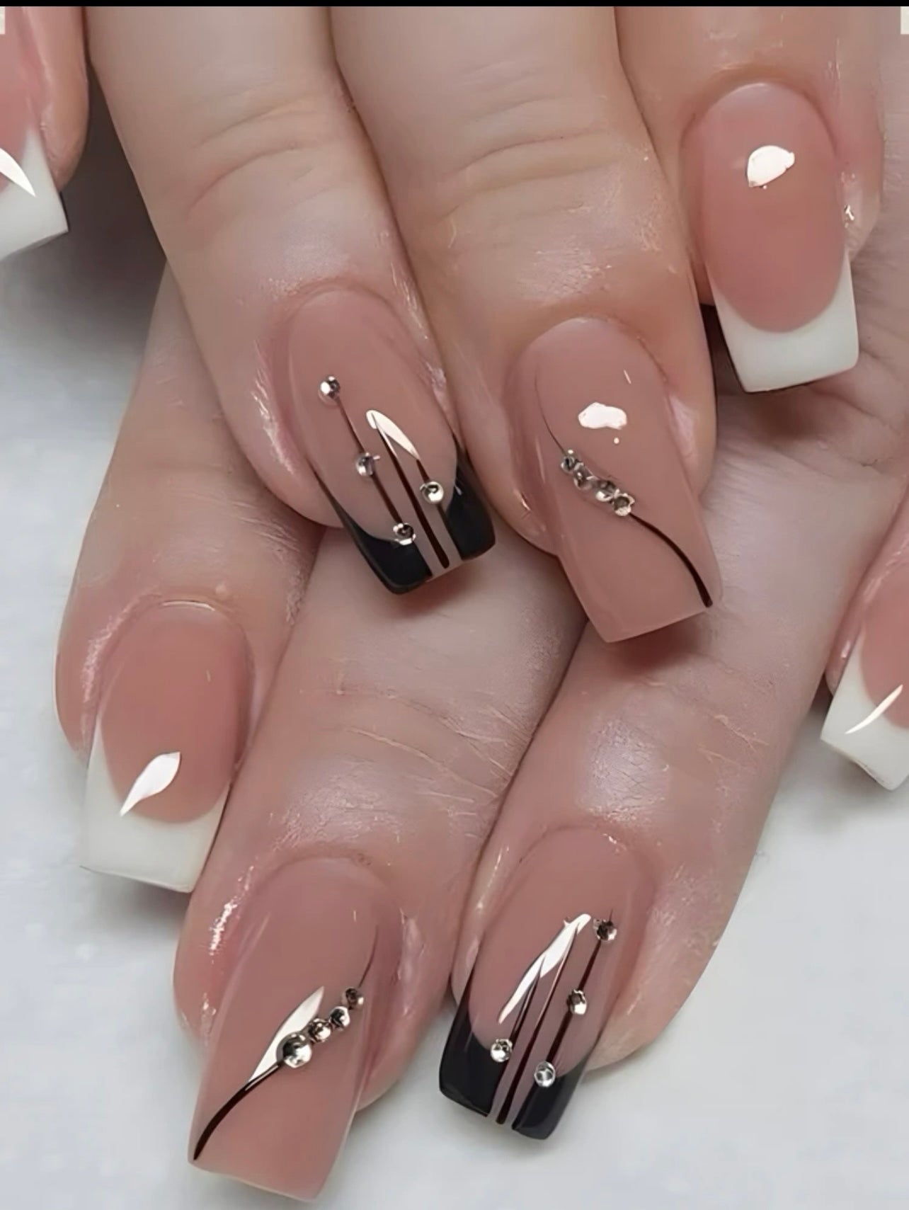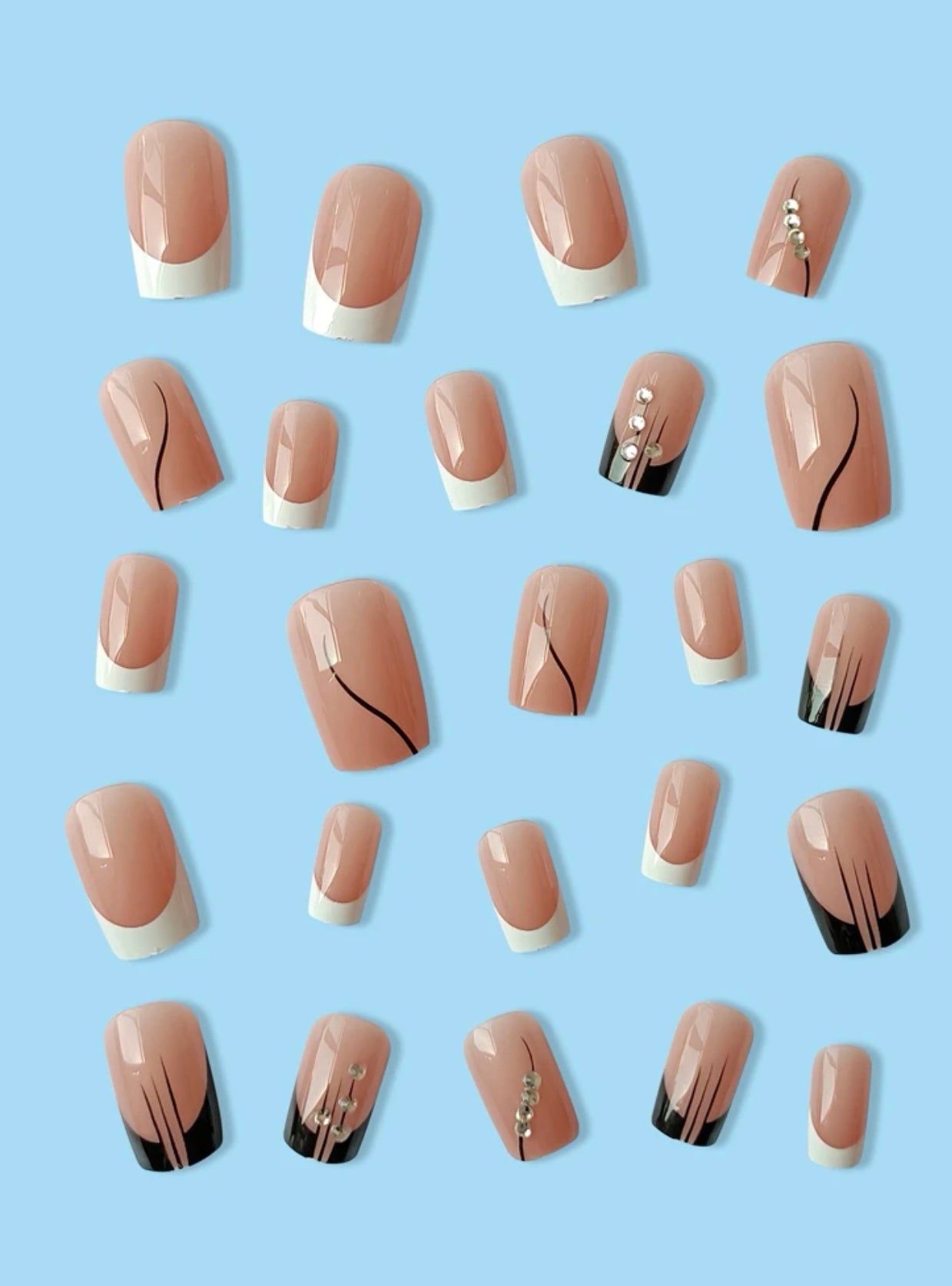 Semi Sheer Nude Rhinestones Square French Press on Nails